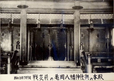 天和元年7月、仙台藩四代藩主 伊達肯山(綱村)は神社を城坤河内の地(現在の青葉区川内亀岡)に移し、立派な社殿を作るため大規模な工事をし宮社を造営、素木造(しらきづくり)、入母屋の屋根を有する拝殿と総朱漆塗流造(そうしゅうるしぬりながれづくり)の本殿でした。同3年8月15日に落成し、遷宮して亀岡八幡宮と称しました。更に祭祀料を八石、百石の地を敬進し宮太夫を山田土佐守の名前に改め、神職に定め三十石の地を給与しました。神職10人、巫女2人、女中2人、酌婦1人、人夫2人をつけました。別当寺を亀岡山積宝寺千手院と定めました。